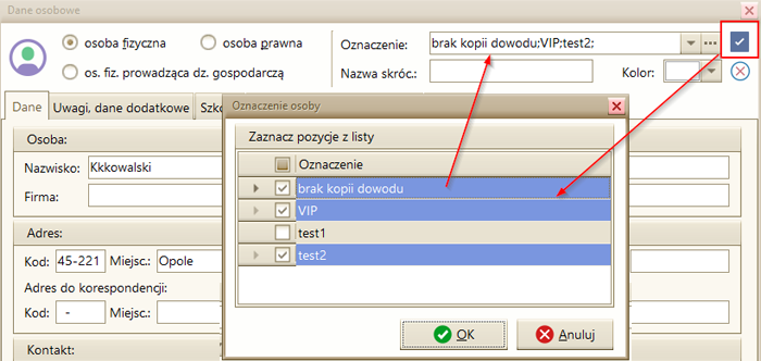 W oknie danych klienta dodano przycisk umożliwiający wybór kilku oznaczeń z predefiniowanej listy (można je także wpisać z klawiatury, oddzielając je średnikami).