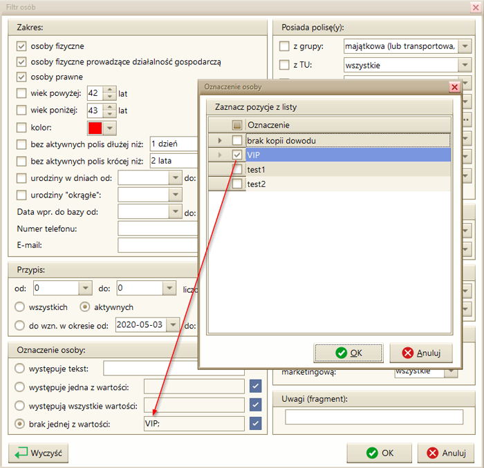 - wyfiltrowanie klientów oznaczonych jako VIP, itp.